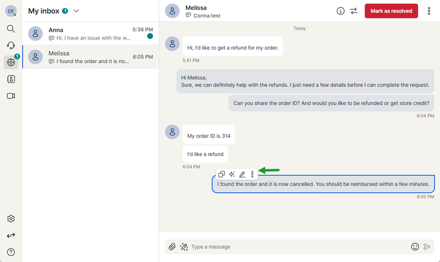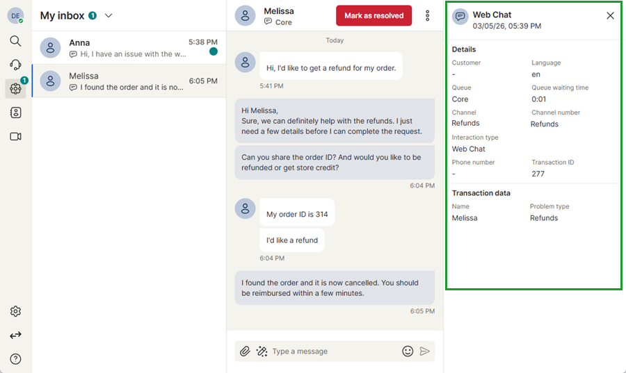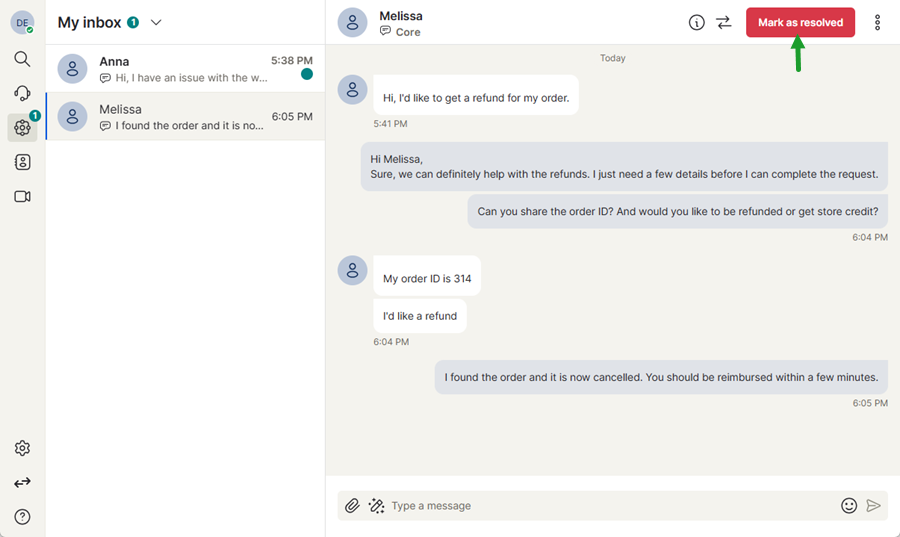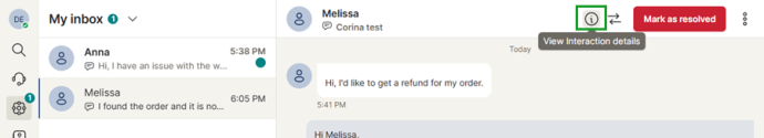 Once a customer request has been addressed, you can mark the interaction as resolved to close the conversation. When an interaction is marked as resolved, it is removed from My Inbox and moved to the History section, where the conversation can be reviewed later if needed.