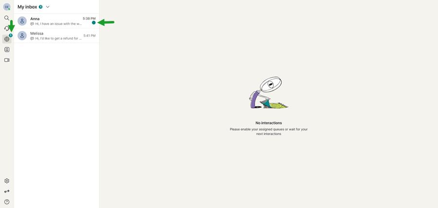 Users can also identify the type of interaction by the icon displayed next to each conversation in the interaction list. In addition, unread messages are indicated by a green dot next to the conversation, helping users quickly identify interactions that require attention.