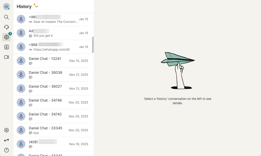 From this section, you can review past conversations, view interaction details, and track previous customer communications across channels such as Webchat, SMS, WhatsApp, Facebook, or RCS and Viber.
