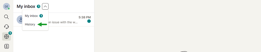 To open History, click the arrow next to My Inbox in the left panel, then select History from the menu. The History view displays interactions that have been marked as resolved or automatically closed.