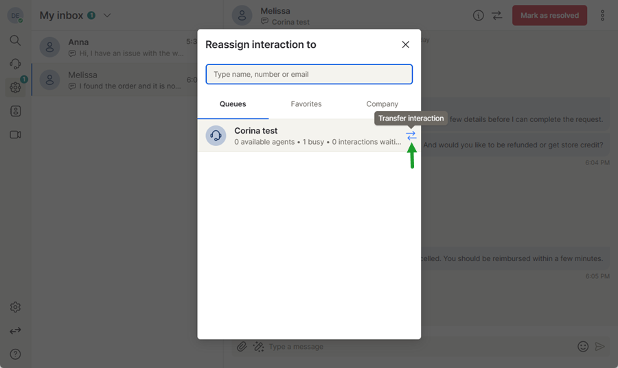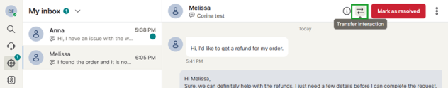 If a customer request requires assistance from another agent or team, you can transfer the digital interaction to another user or queue. Open the conversation in My Inbox and click the Transfer interaction