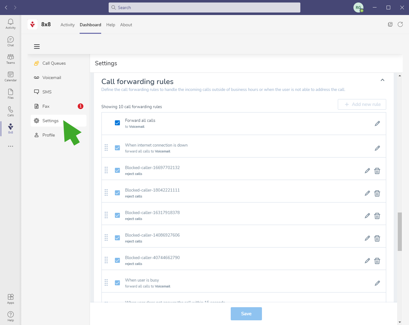 Note: 8x8 enables you to manage call forwarding rules for your extension, if the administrator has already configured this in 8x8.