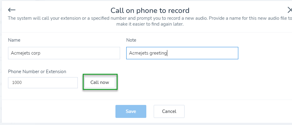 Click Call now. The Recording is in process screen displays. After the recording is complete, click Finished Recording, then click Save on the Call on phone to record screen.