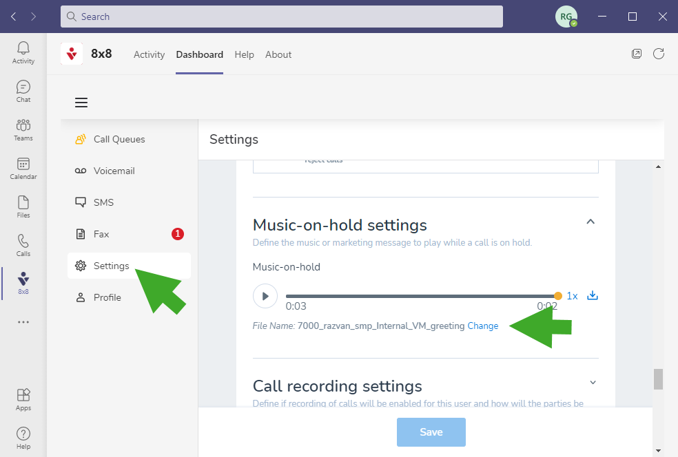 - In the 8x8 for Microsoft Teams app (8x8 Teams app), go to Settings