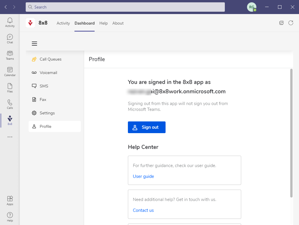 - Click Sign out. This signs you out of the 8x8 Teams app, but you are still signed into Microsoft Teams.