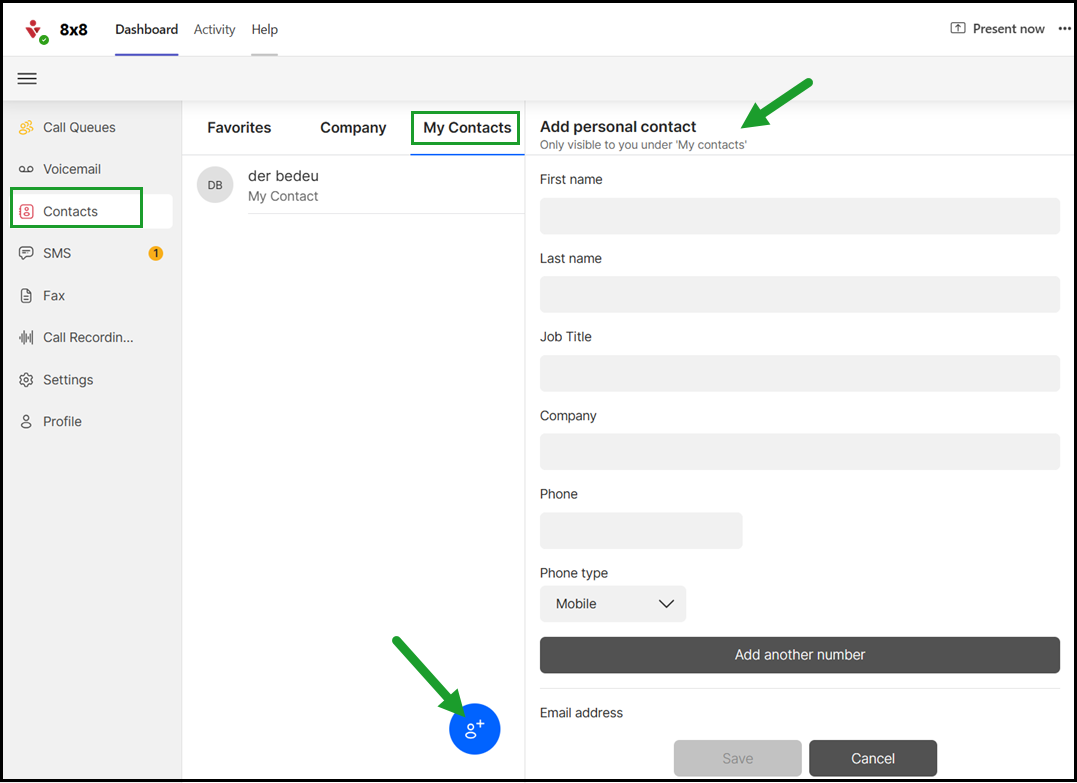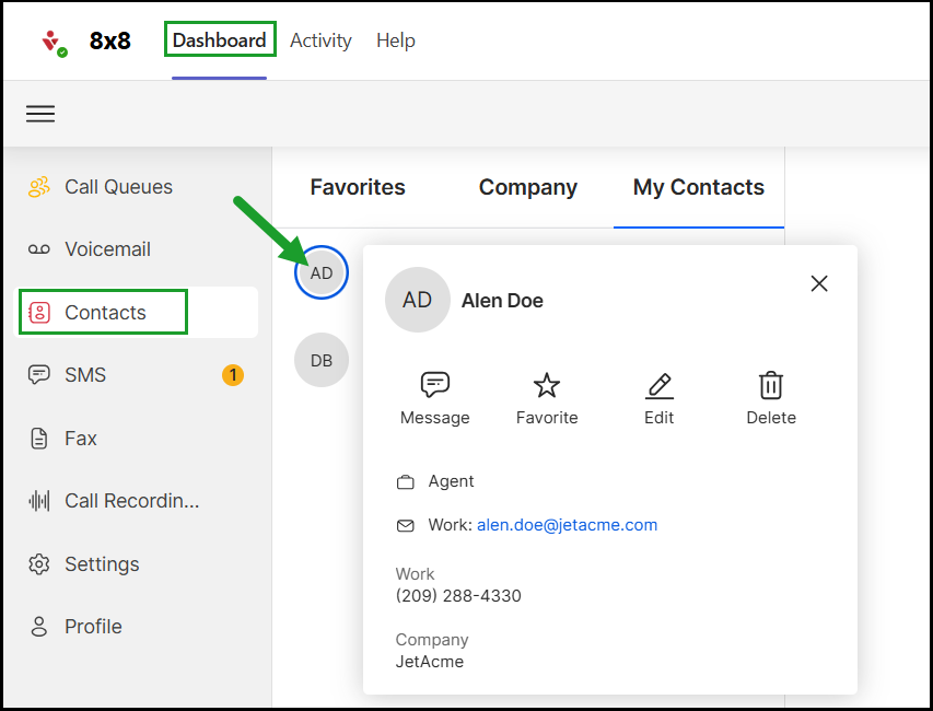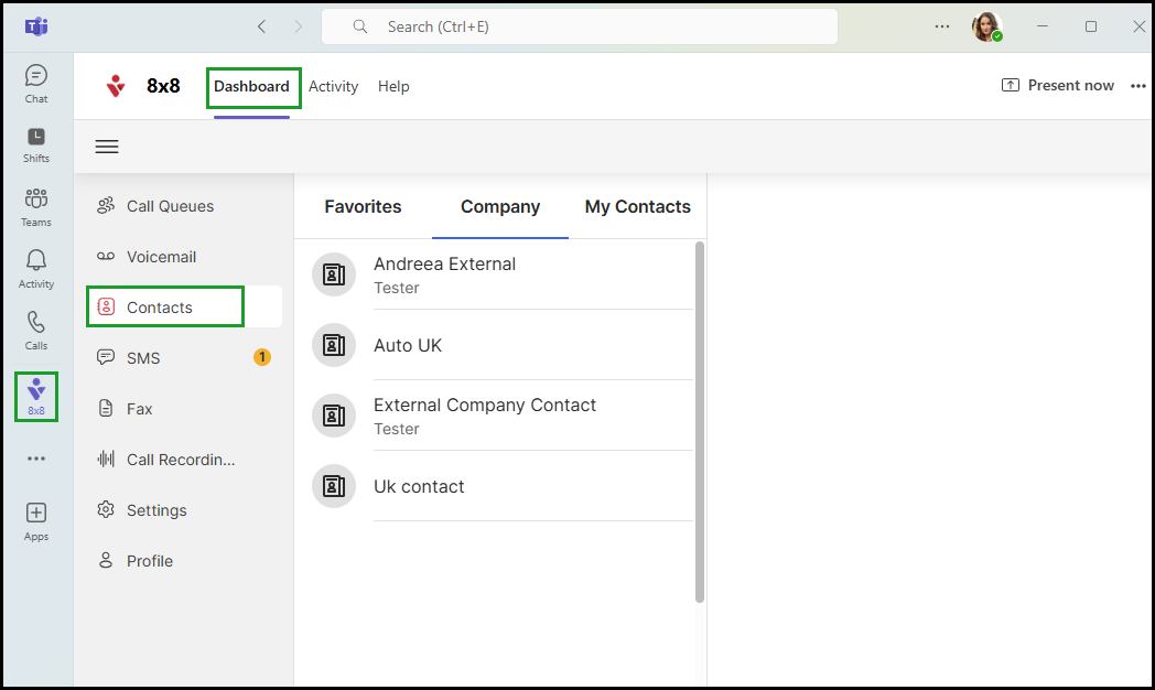 - In the 8x8 for Microsoft Teams's Dashboard, select Contacts