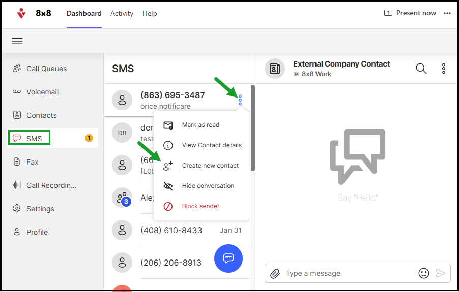 - Company contacts set up through the 8x8 Admin Console app nay be linked with the corresponding SMS conversation.