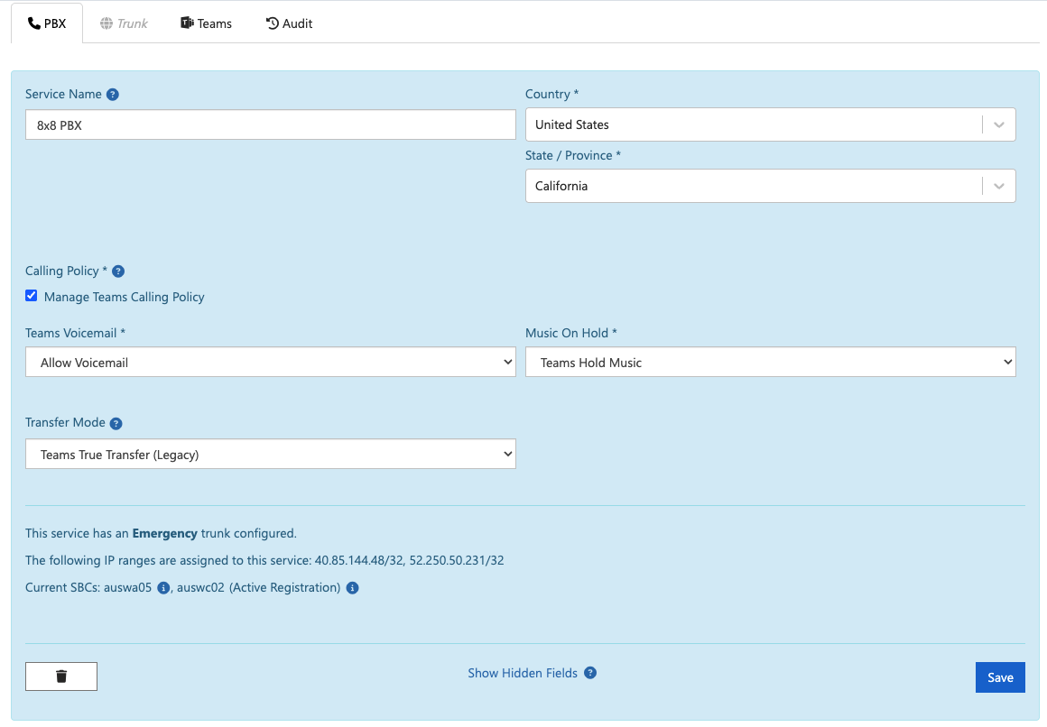 - Country and State / Province: Configure the location that your 8x8 service is based in.