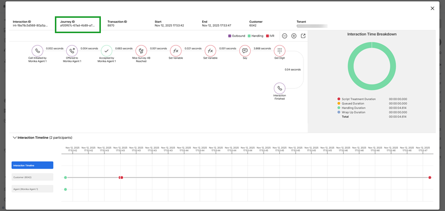 You’ll see the Journey ID at the top-left of the interaction flow and as a filter metric in the report. Use the Journey ID to find and review every segment from start to finish.
