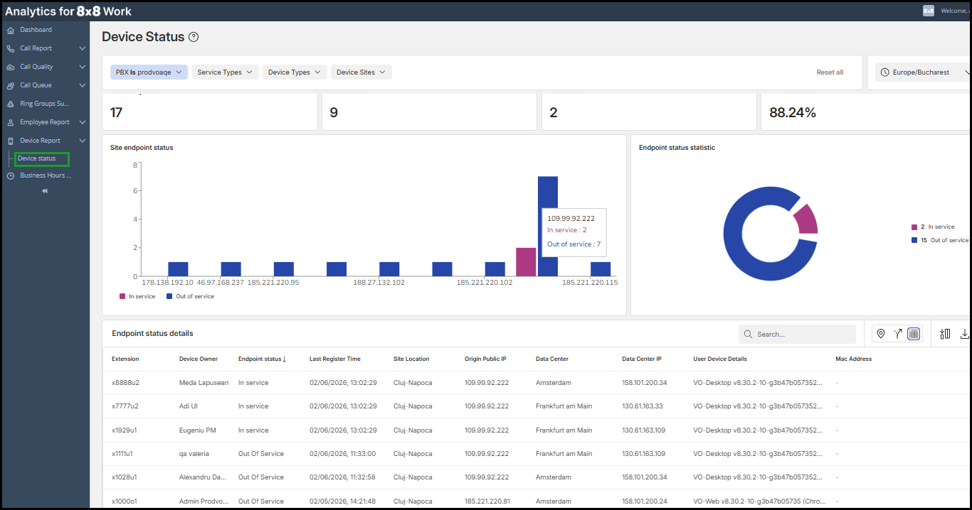 The Device Status dashboard provides real-time information for all endpoint devices in your 8x8 cloud phone system.