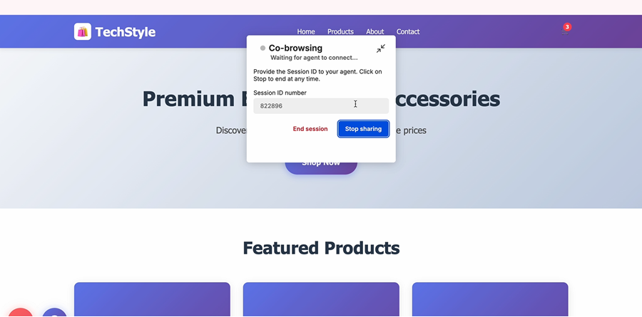 - Once connected, the session becomes active. You'll see the customer’s shared page, and your mouse will be visible to guide them through the site.