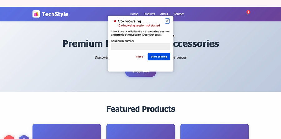 - In the pop-up, the customer clicks Start sharing to generate a unique session ID.
