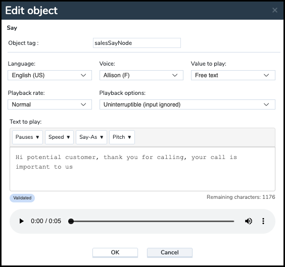 This object converts programmed text and variable objects such as phone number and queue position into speech. The Say object is also interruptible or not. For details, see our content on Text To Speech. Parameters:- Object Tag: Enter the alphanumeric label used to uniquely identify the element in the IVR script.