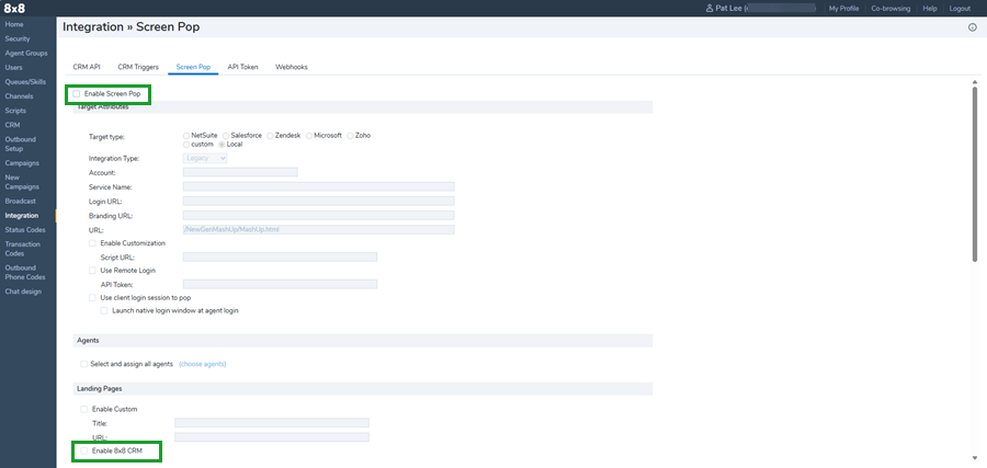 - In the Landing Pages section, disable the Enable 8x8 CRM check box.