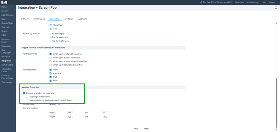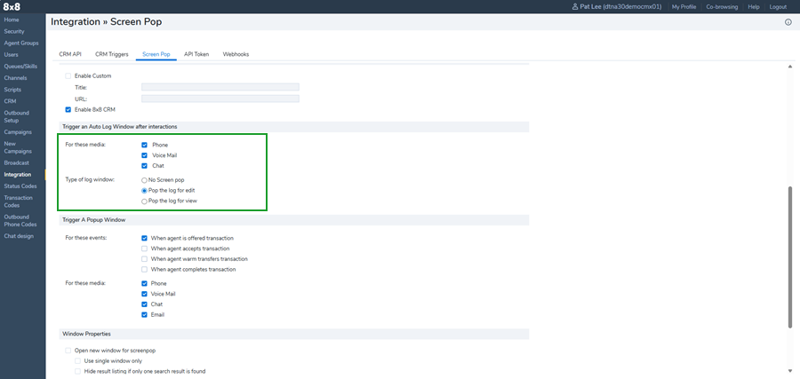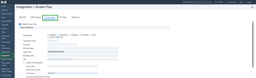 Note: If you clear the Enable Screen Pop check box in 8x8 Configuration Manager, all custom screen pop integrations are disabled at the tenant level.