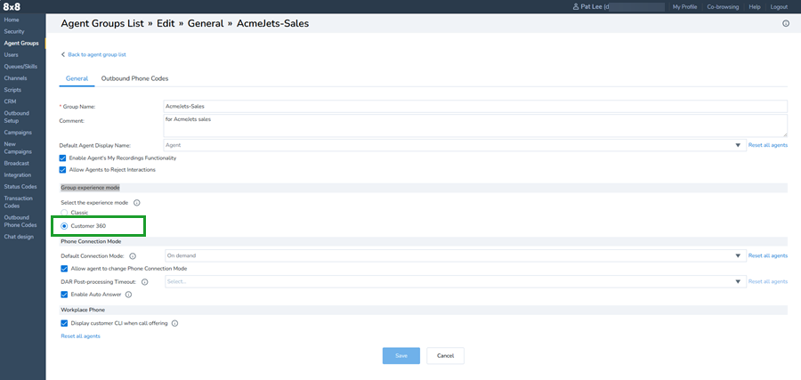 . To learn how to create a new group, see Add an agent group and assign to outbound phone codes. - From the Group experience mode, select Customer 360.