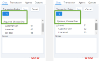 Codes can be configured to be optional or required. If your contact center administrator configures a code list as mandatory, as you process interactions, you are required to select transaction codes. You can end processing a call only after selecting the desired codes.![]()