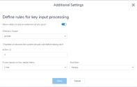 - Click Edit Setting next to Menu to set up additional rules for when callers fail to select an option from the call menu. By default, the auto attendant menu replays once. Further failure of action from callers results in a dropped call. However, you can edit these settings to edit the number of menu replays and call routing when there is no action by callers. You can also allow callers to dial an extension at any time, define the scope of contact directory whether it is one site or all sites, the number of seconds the system waits after each input, the number of replays, and the final action whether to route the call or hang up.