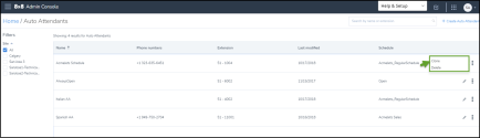 next to the desired auto attendant. - To delete an auto attendant, go to Home > Auto Attendants > Auto Attendants and click