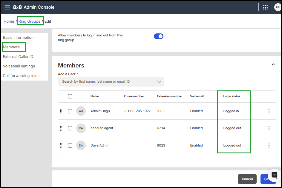 Enable the Allow members to log in and out from this ring group option to allow users to manually control their availability in 8x8 Work apps.