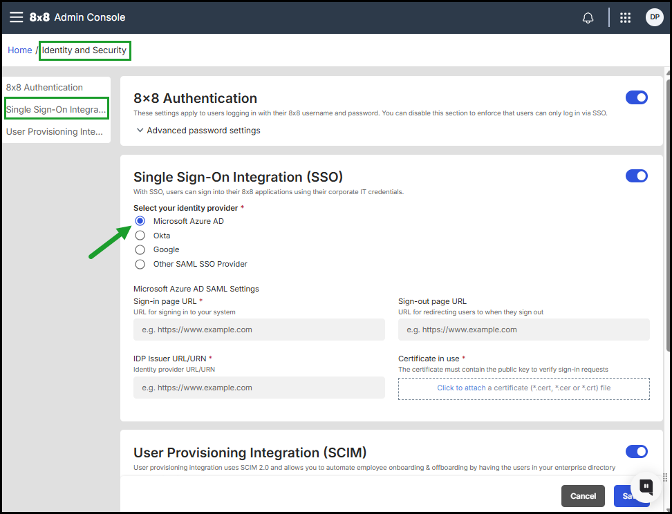To learn more, see Azure (Entra) AD: 8x8 Single Sign-On (SSO) and User Provisioning (SCIM) Configuration.