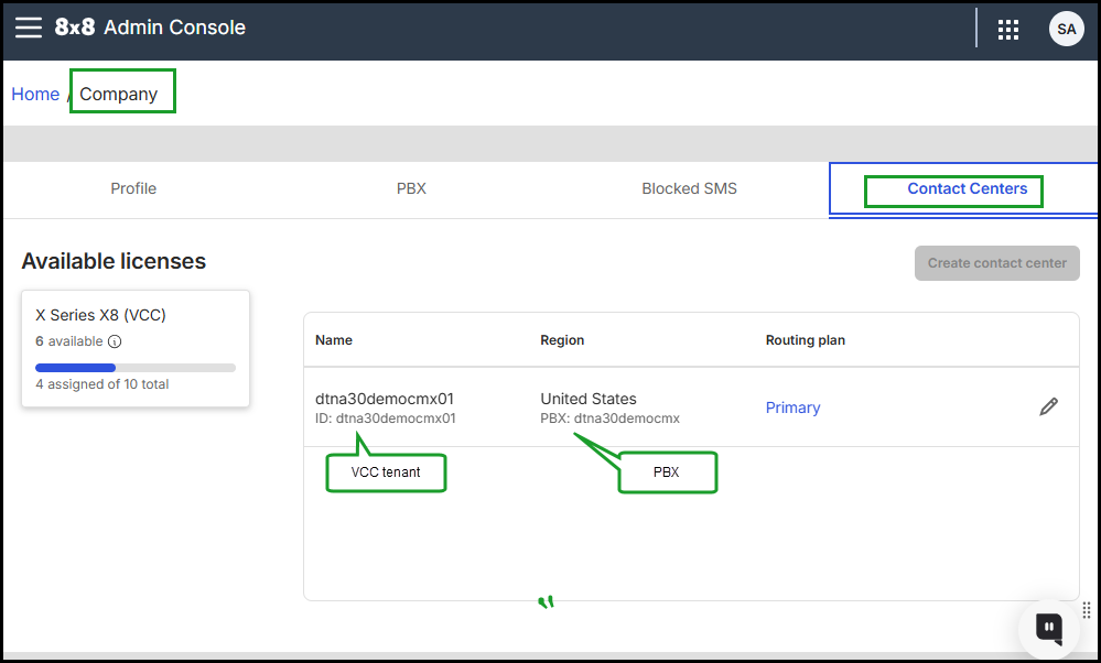 - On the Company > Contact Centers tab, you can see which PBX is linked to your VCC tenant.
