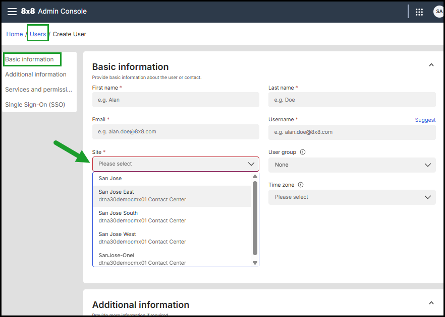 Note: When creating a site that includes VCC users, you must ensure the site belongs to the VCC-enabled (Contact Center) PBX.