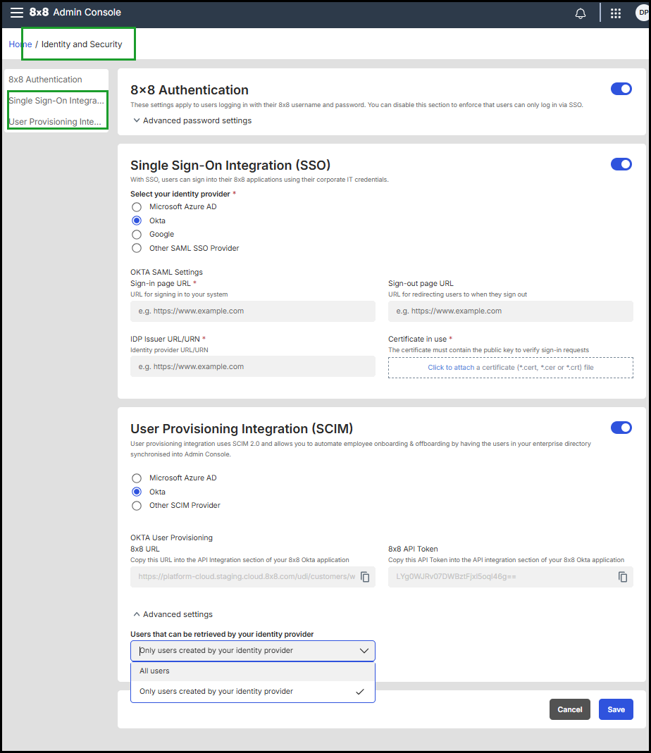 8x8 URL: Copy and paste this URL into your SCIM provider’s configuration page.