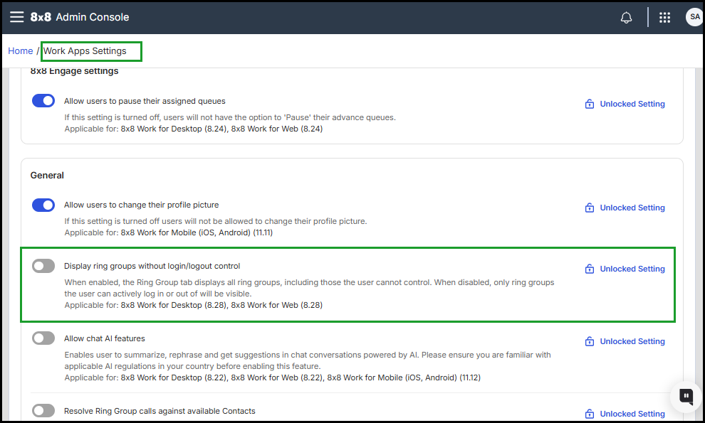 Administrators can now use the new Display ring groups without login/logout control setting in Work Apps Settings to control the visibility of non-interactive ring groups in 8x8 Work for Desktop and Web. This helps reduce clutter and makes the Ring Groups tab in 8x8 Work for Desktop and Web easier to navigate by allowing admins to hide ring groups that users cannot log into or out of.