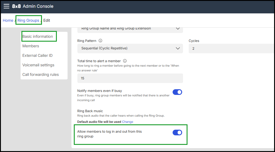 next to the desired ring group. - Under Basic information, locate Allow members to log in and out from this ring group.