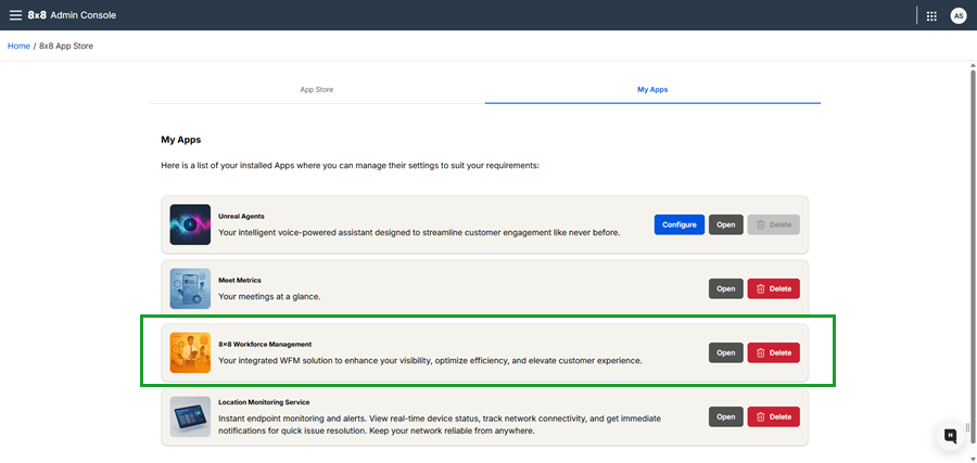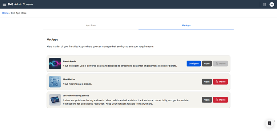 You can manage installed applications within the 8x8 App Store from the My Apps tab, where you can configure settings, launch integrations, or remove unused apps.