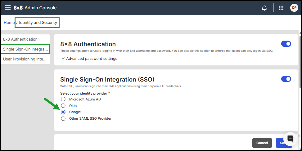 Organizations that use identity management systems such as Google SSO, Microsoft Azure AD, Okta, or any SAML-compliant provider can configure SSO in 8x8 Admin Console. This enables employees to log in using their corporate identity rather than a separate 8x8 username and password.