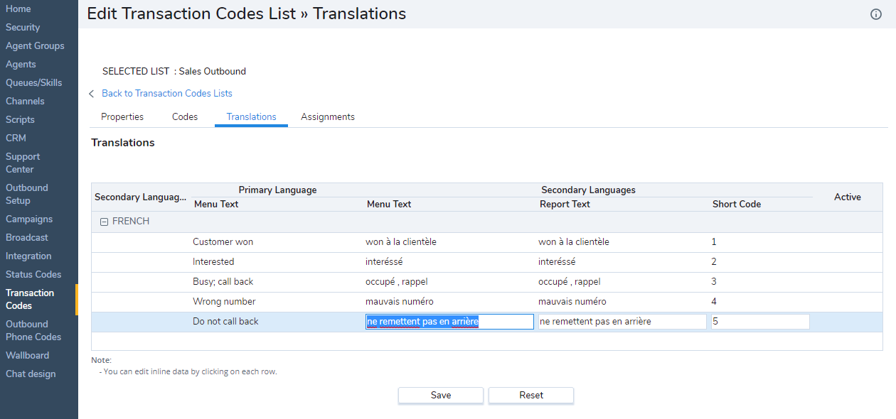 L’onglet Traductions vous permet de traduire les codes de la langue principale à la langue secondaire prise en charge par 8x8 Contact Center. Vous devez préciser une langue secondaire dans l’onglet Propriétés pour activer la traduction. Cette procédure est facultative.