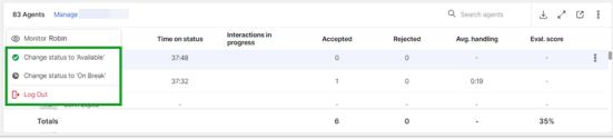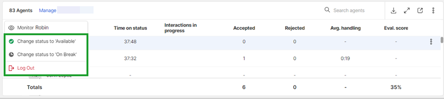 Based on the agent's current status, some of these options are displayed:- Change status to 'Available': Select this option to enable an agent to receive new interactions.
