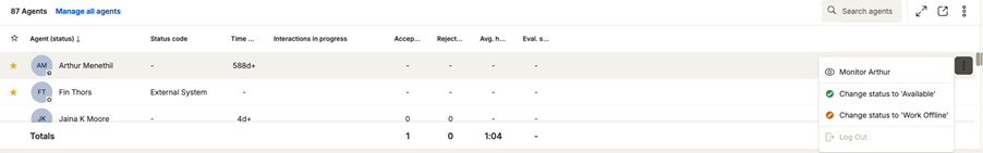 For example, if an agent forgets to log out after their shift, you can do it for them. This prevents the agent from receiving customer interactions while unavailable. We recommend communicating any status changes to your agents to ensure they understand why their availability changed and can plan their work accordingly.