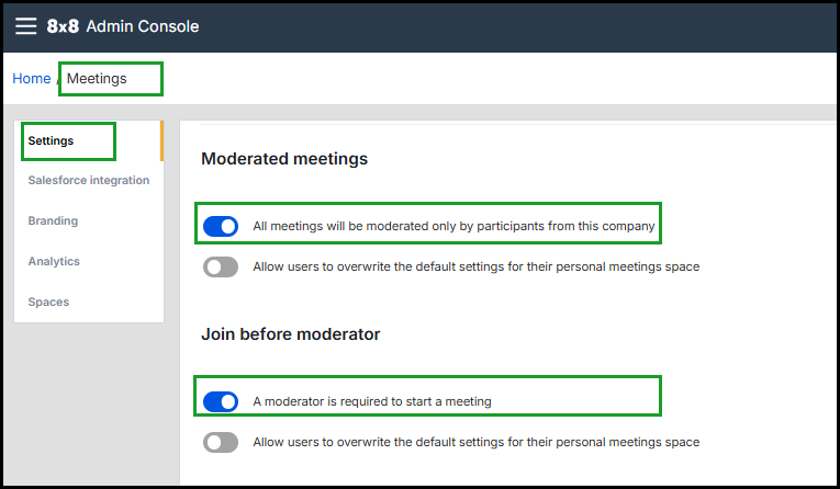 eu Note: The ability to control user access to moderator settings is available to 8x8 Meet users with access to meeting admin settings, and to 8x8 Work administrators via 8x8 Admin Console or Meetings in the 8x8 Application Panel.