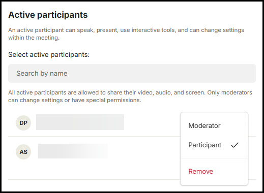 - Large meeting – Best for high-attendance events. Roles are pre-assigned as participants and moderators. All others are viewers, who can be promoted to a participant or moderator, as applicable.