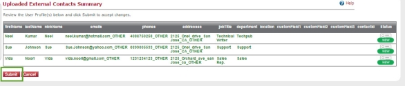 The new contacts appear in the External Directory Upload table.