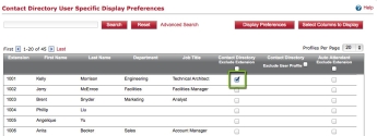 By default, user profiles assigned to an extension are shown in the contact directory. However, phone system administrators can also choose to display contact information for user profiles not assigned to an extension. User profiles not assigned to an extension are displayed in the table below the extensions. To display contact information for a non-extension user profile, clear the corresponding check box in the Contact Directory Exclude User Profile column.